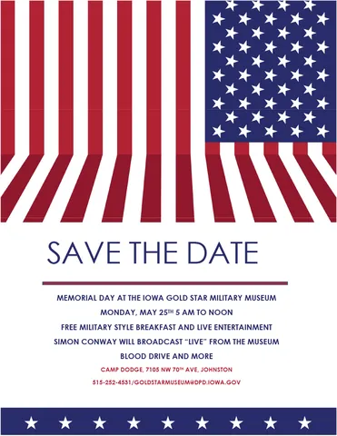 Save the Date Memorial Day at the Iowa Gold Star Museum May 25, 2026 Monday 5 AM to Noon.